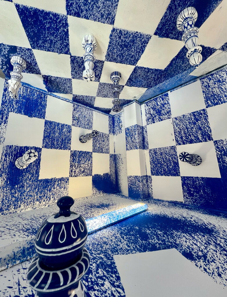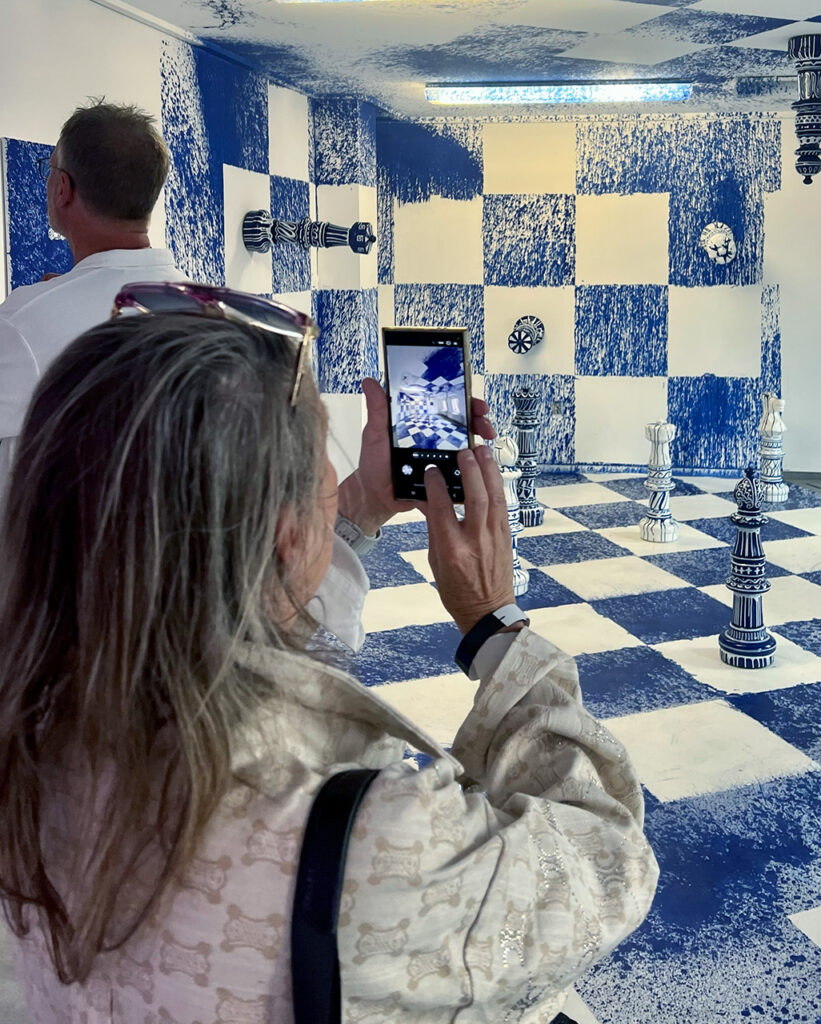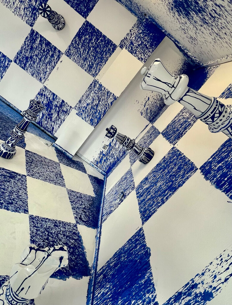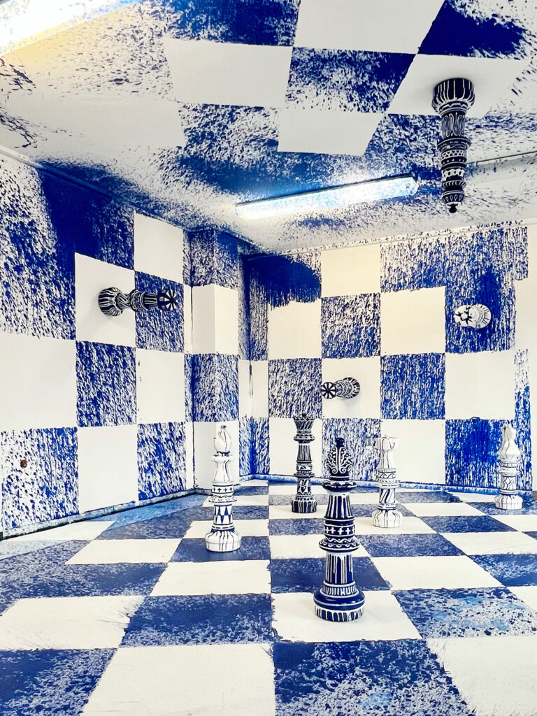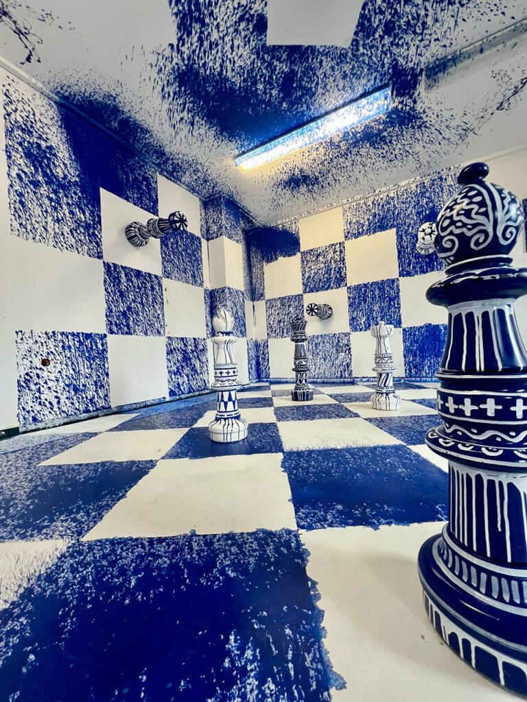 The installation translates this tension into a walkable chessboard. Yet what matters most is what is missing: the kings. No central authority, no crown, no hierarchy. Instead, the board itself becomes a space of possibility.