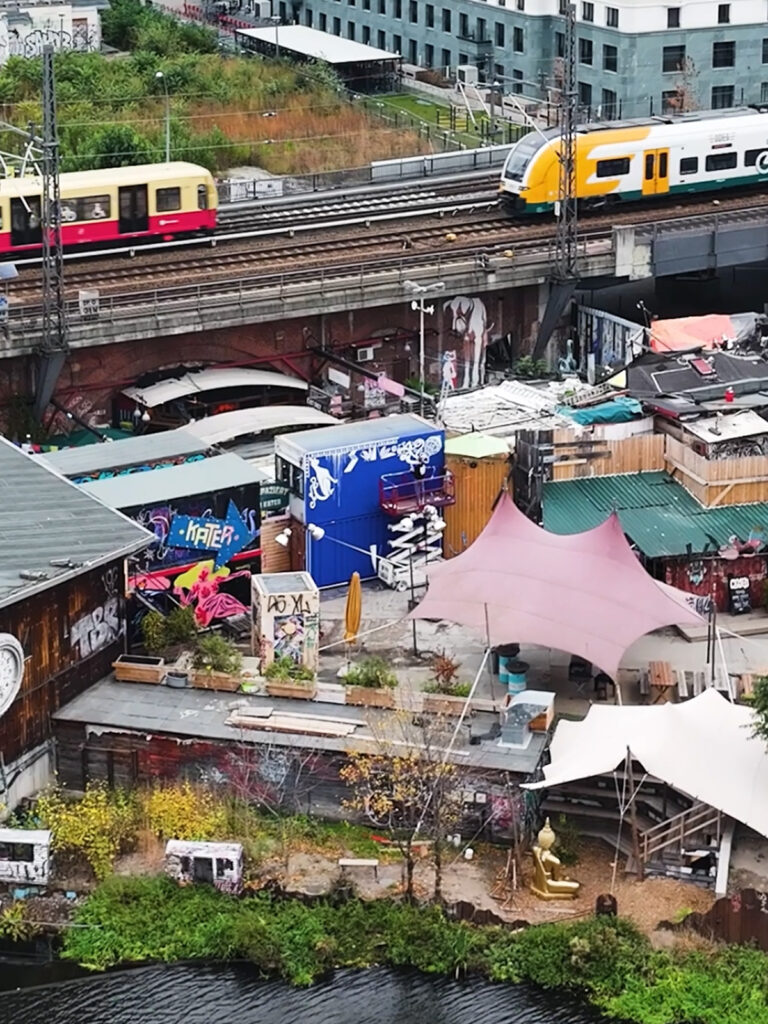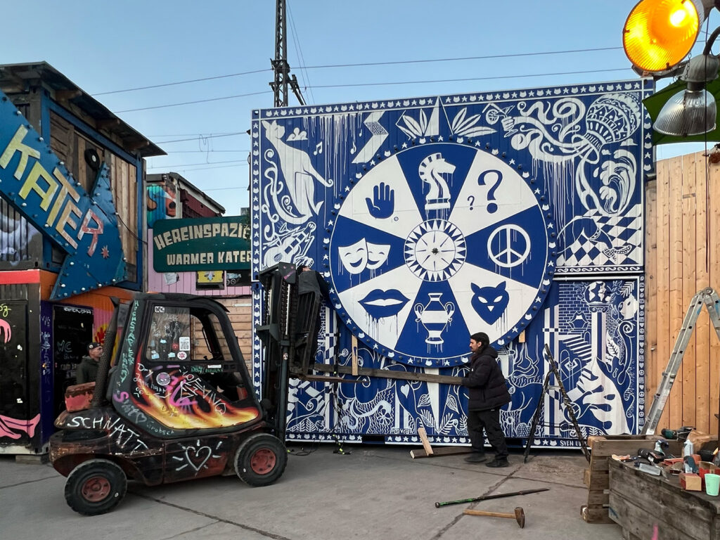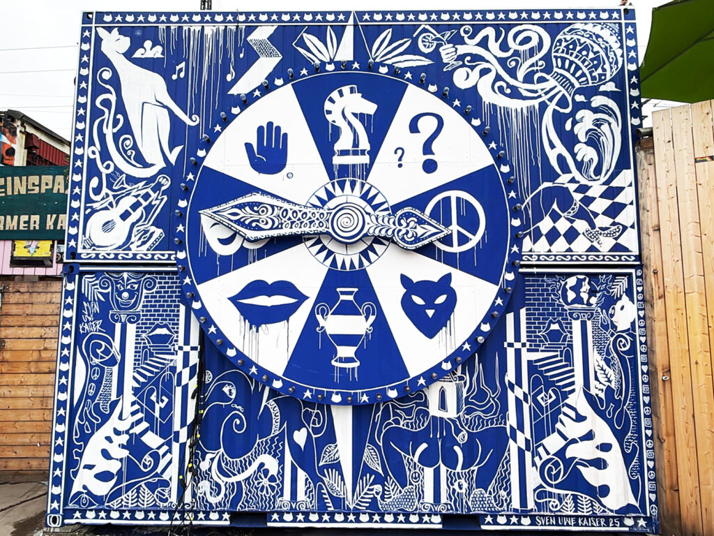 This interactive mural was created at the entrance of „Holzmarkt 25“, a cooperative creative district on the River Spree in Berlin-Friedrichshain. The 12,000 m² site combines culture, gastronomy, crafts, markets and urban gardens, forming one of Berlin’s most vibrant public spaces. The artwork takes the form of an interactive “wheel of fortune” and reflects the diversity and atmosphere of the site. Symbolic elements reference culture, creativity, water, dance, community and Berlin’s cosmopolitan identity.