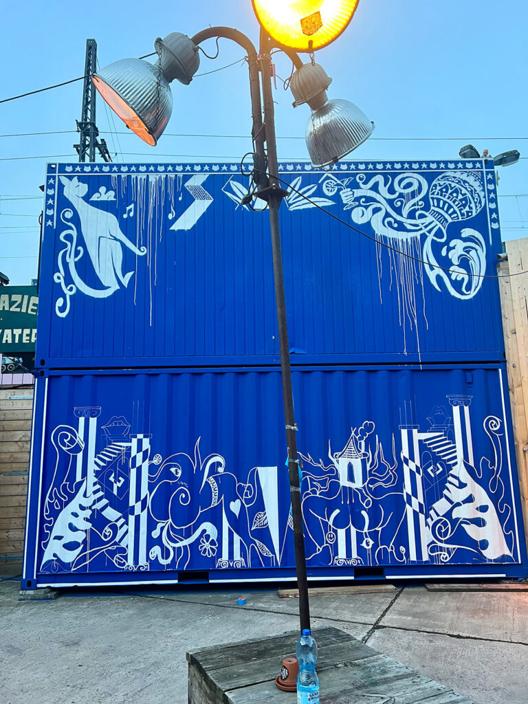 A vase pours waves symbolizing both artistic energy and the nearby river; a cat refers to the adjacent dance venue “Kater”; dancing limbs suggest movement and exchange; a globe represents openness; and plants frame the composition, echoing Berlin’s green spaces. Originally commissioned to paint two containers, I proposed transforming them into a participatory artwork that invites physical interaction. Visitors spin the wheel and receive playful prompts, encouraging engagement and shared experience rather than passive viewing.